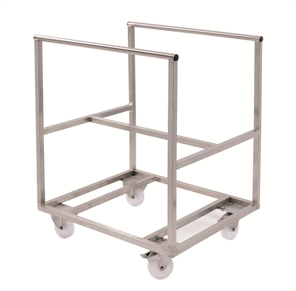 Chariot porte plateaux en inox pour bac grand volume semi cylindrique. Ce chariot a été conçu de manière optimale pour les professionnels, il est le fruit de l'entreprise française Gilac spécialiste des bacs alimentaires depuis plus de 75 ans.