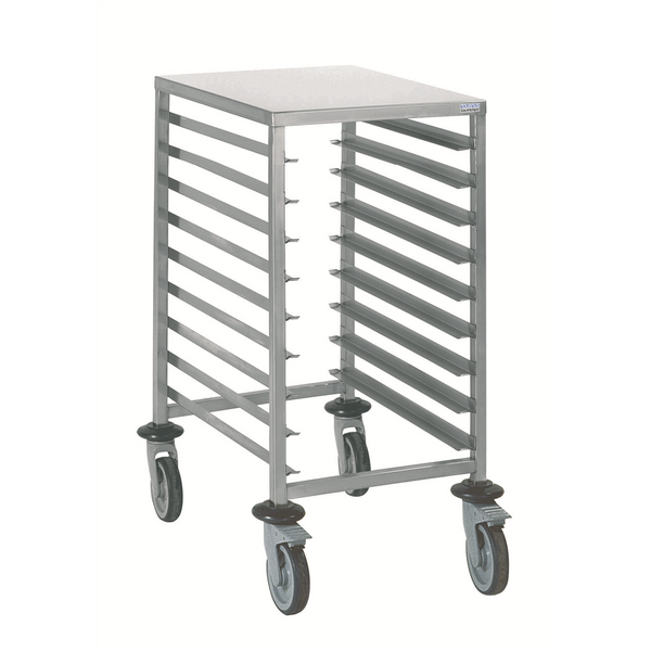 Tablette supérieure en tôle inox 15/10ème mm sur chariot 9 niveaux.